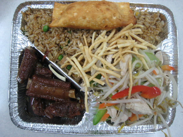 ​(Shrimp, Chicken and BBQ Pork stir-fried with vegetables on a bed of thin Egg Noodles) |